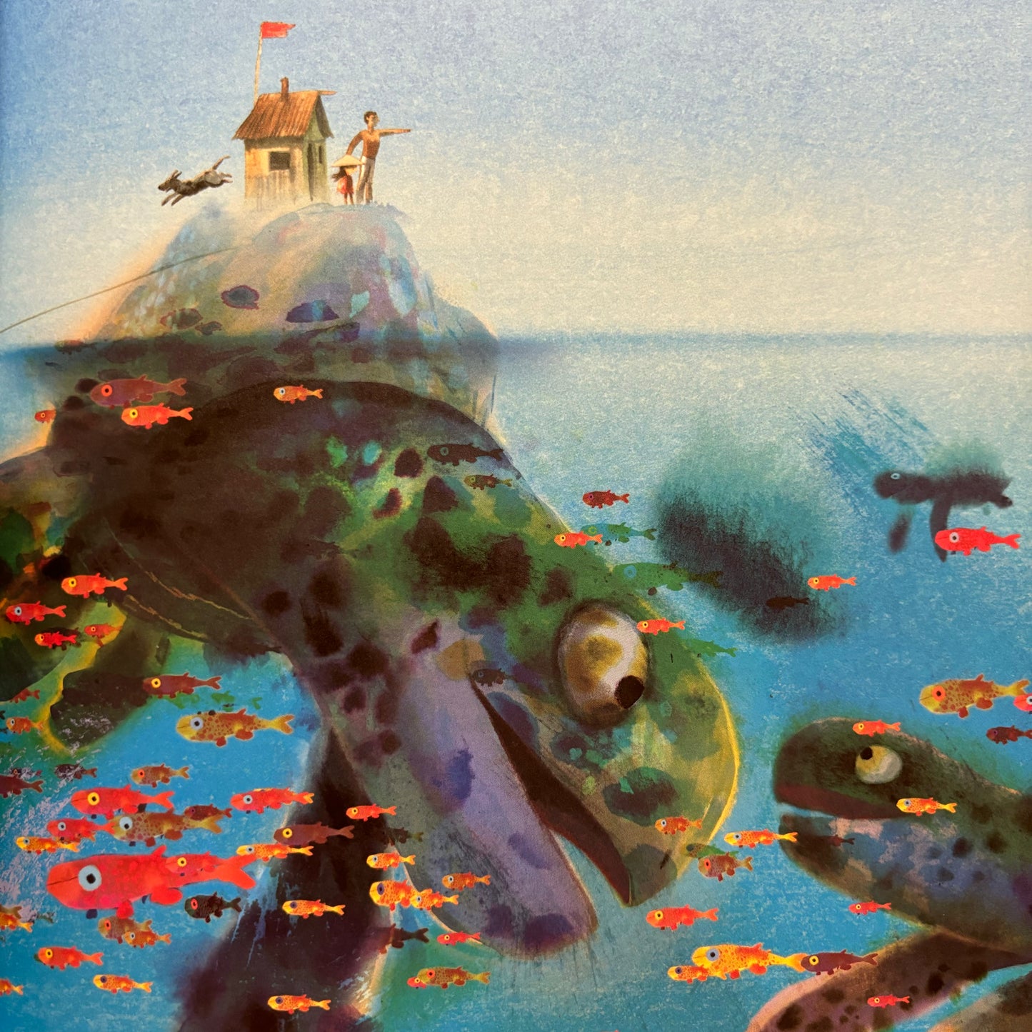 Eiland beschermt de drie tegen wind en kou, tegen golven en gevaar, en voert hen door een prachtige wereld.
