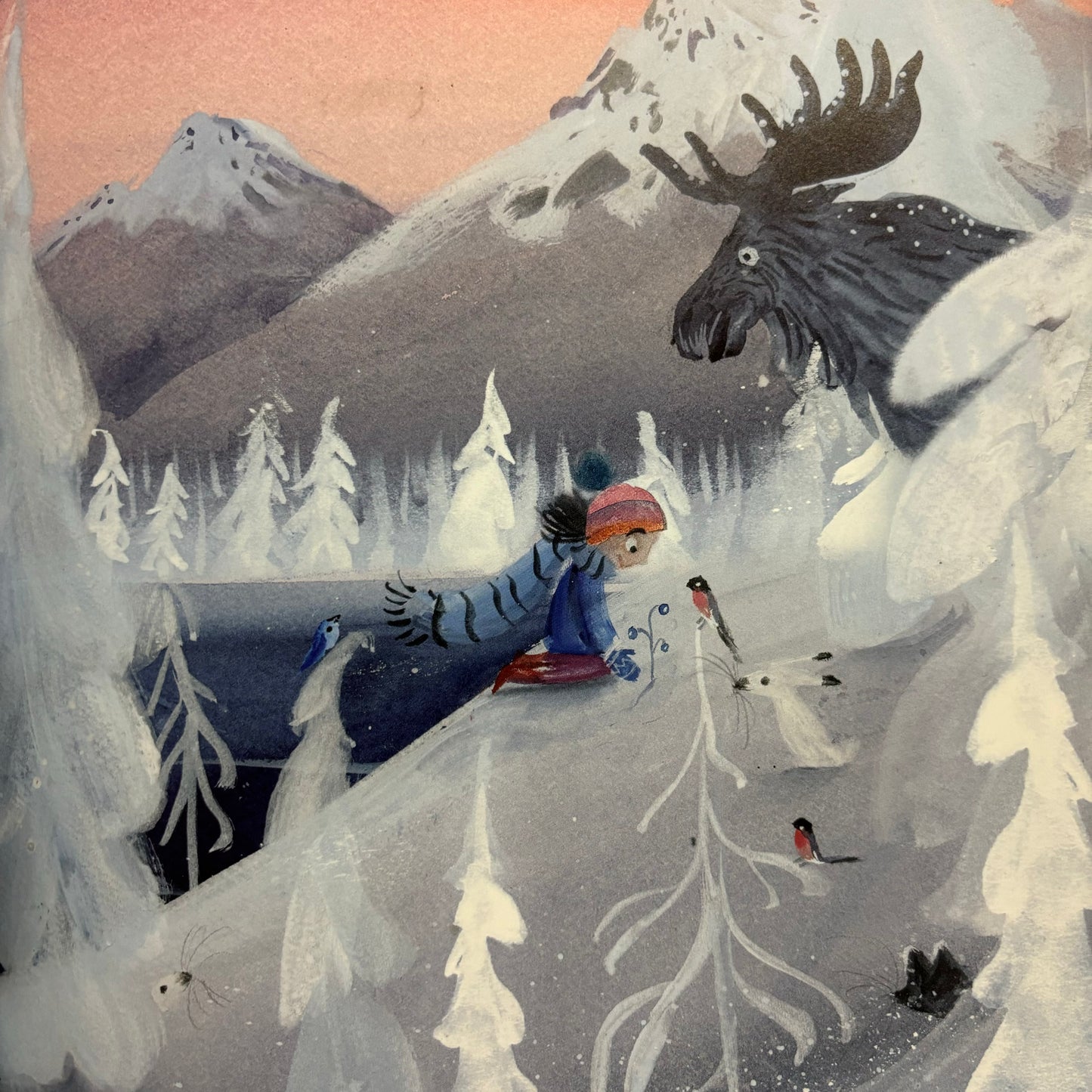 Als Sofie door de stad dwaalt, steekt er een sneeuwstorm op. En midden in die witte wereld doemt opeens een gedaante op: een eland, die Sofie meeneemt naar het winterbos. Daar staat, tussen alle grote bomen, een kleine dennenboom, als een kerstboom zonder versiering.