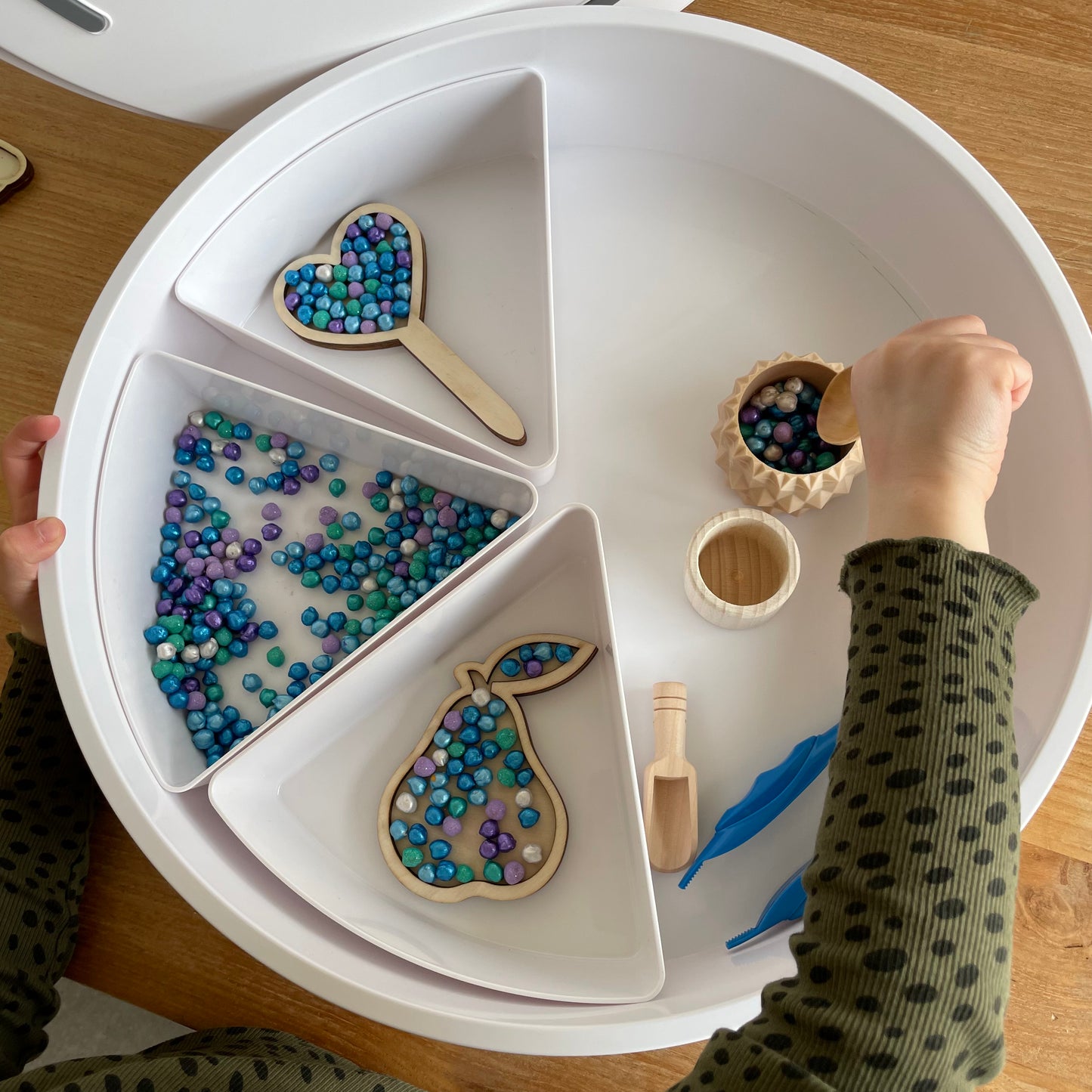 Deze activiteiten bak is geweldig voor je sensorische spel. Doordat je 6 aparte bakjes hebt, kun je verschillende sensorische basisvullingen tegelijkertijd aanbieden. Je kunt ook de 6 bakjes eruit halen en de grote ronde tray los gebruiken.